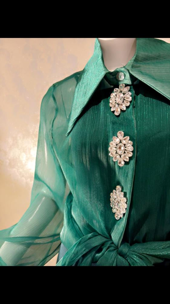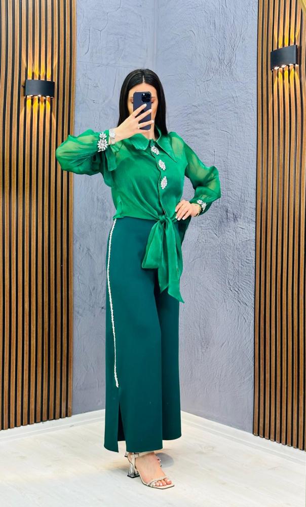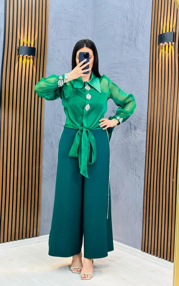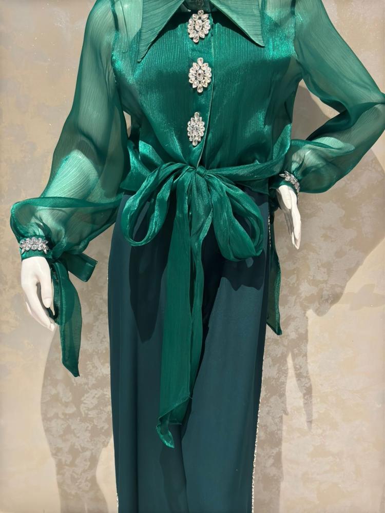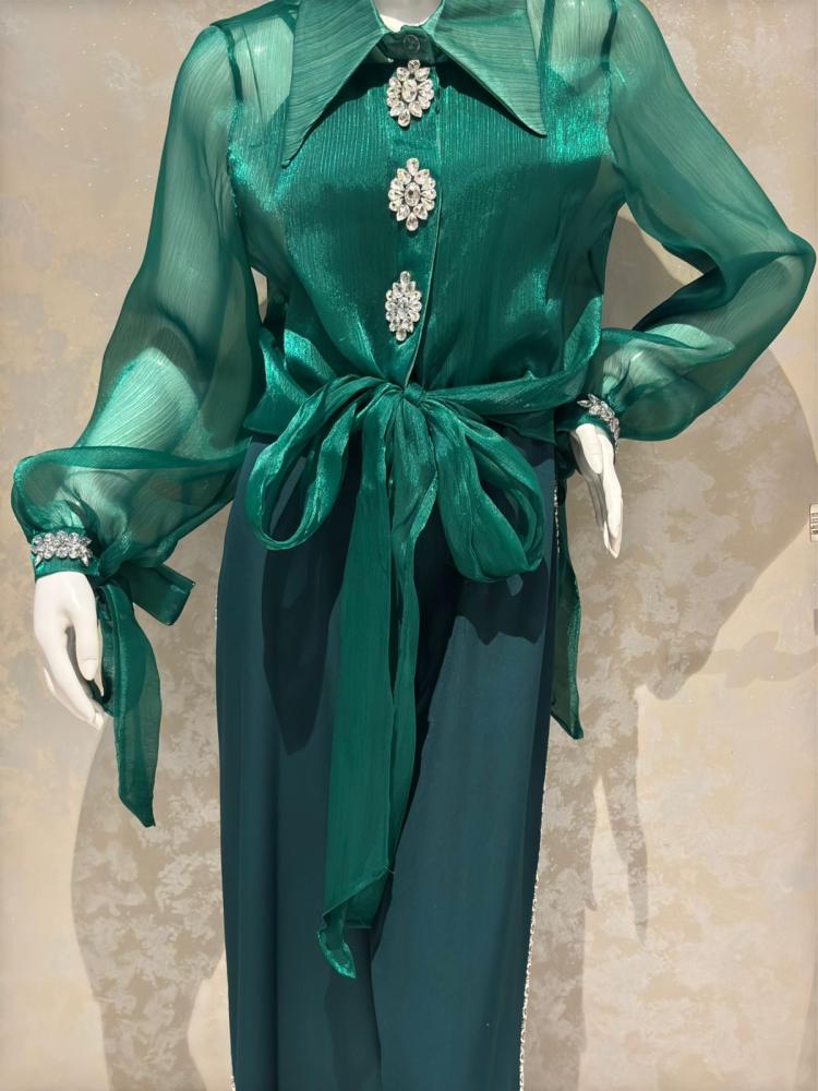 جمبسوت أنيق بتصميم بسيط وفخم، يتميز بقصته الناعمة والمثالية للمناسبات. الجزء السفلي عبارة عن بنطلون بتصميم مستقيم، مزين بتطريزات كريستالية براقة على الأطراف تضيف لمسة من الفخامة والجاذبية. أما الجزء العلوي فهو بلوزة بياقة مرصعة بالكريستال تضفي لمسة أنيقة وعصرية، مع أكمام طويلة مزينة بالكريستال بشكل متناغم يكمل جمال التصميم. الطقم يعكس مزيجًا من البساطة والرقي، مما يجعله خيارًا مثاليًا للمناسبات الرسمية والسهرات.