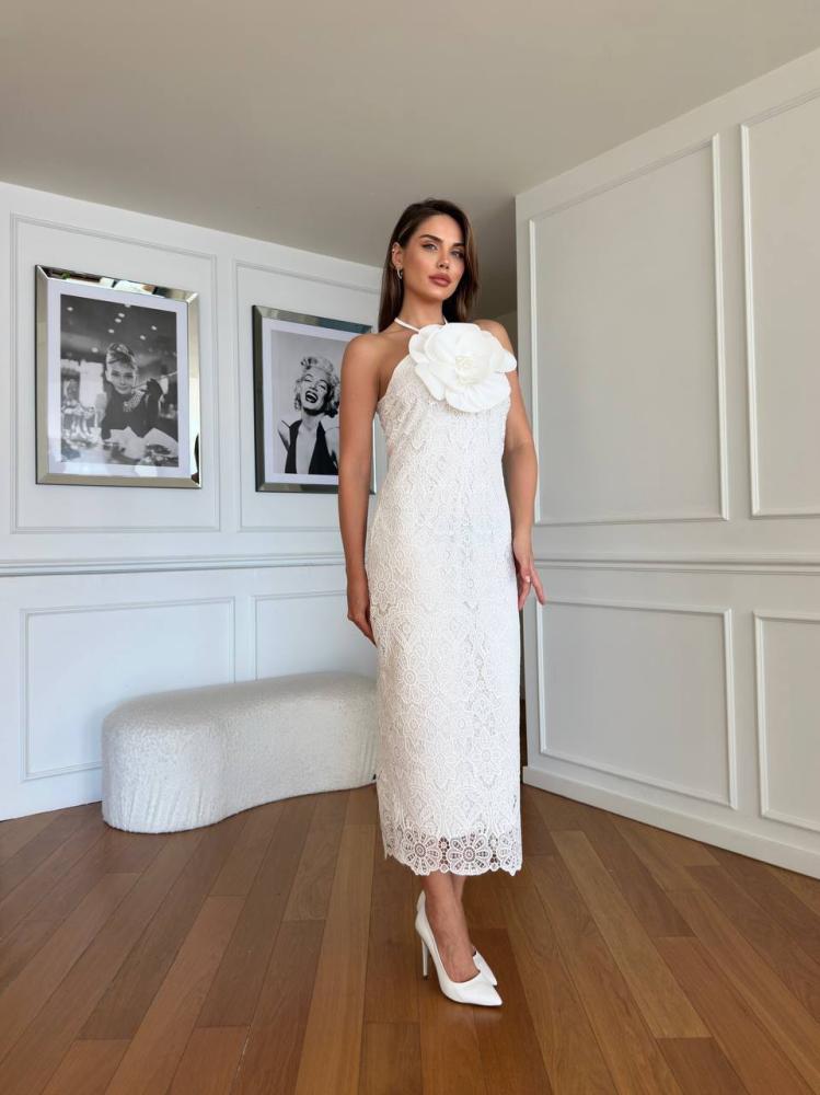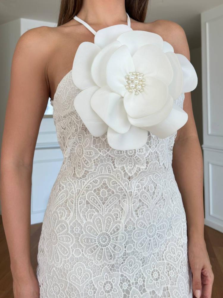 .فستان أنيق مصمم من قماش الدانتيل الرقيق والمميز، مزين بورود مطرزة بعناية بحبات اللؤلؤ اللامعة التي تضيف لمسة من الفخامة والرقي.