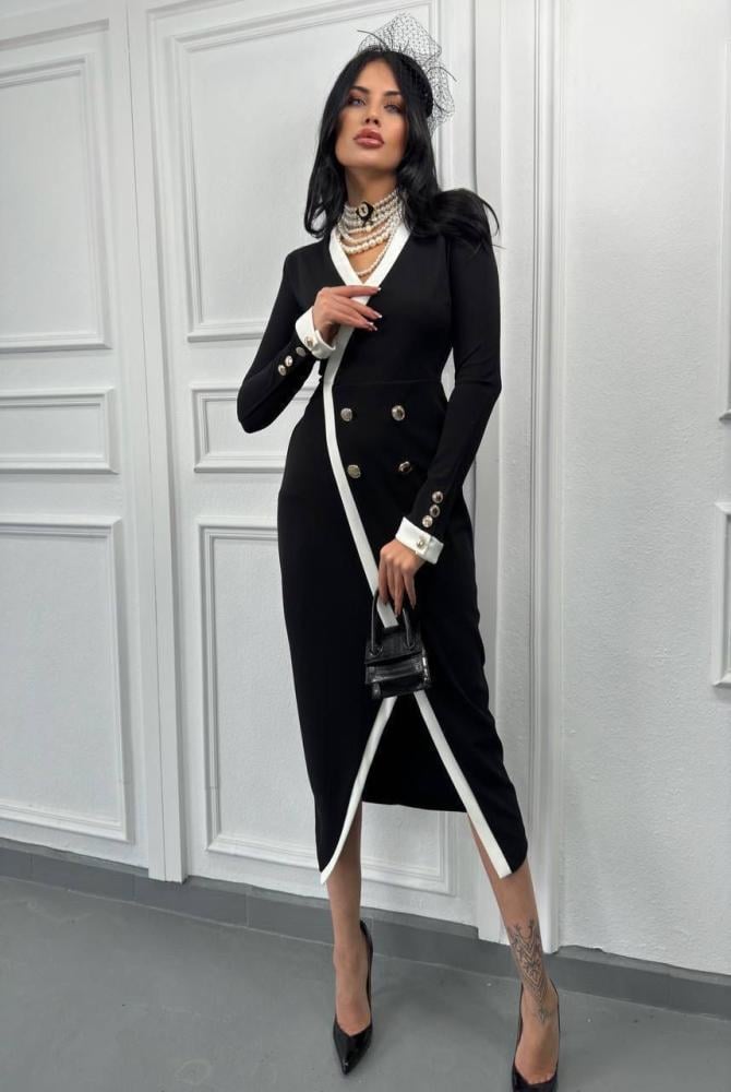 فستان كلاسيكي أسود وأبيض يتميز بالأناقة واللمسات العصرية. التصميم بسيط وأنيق .
